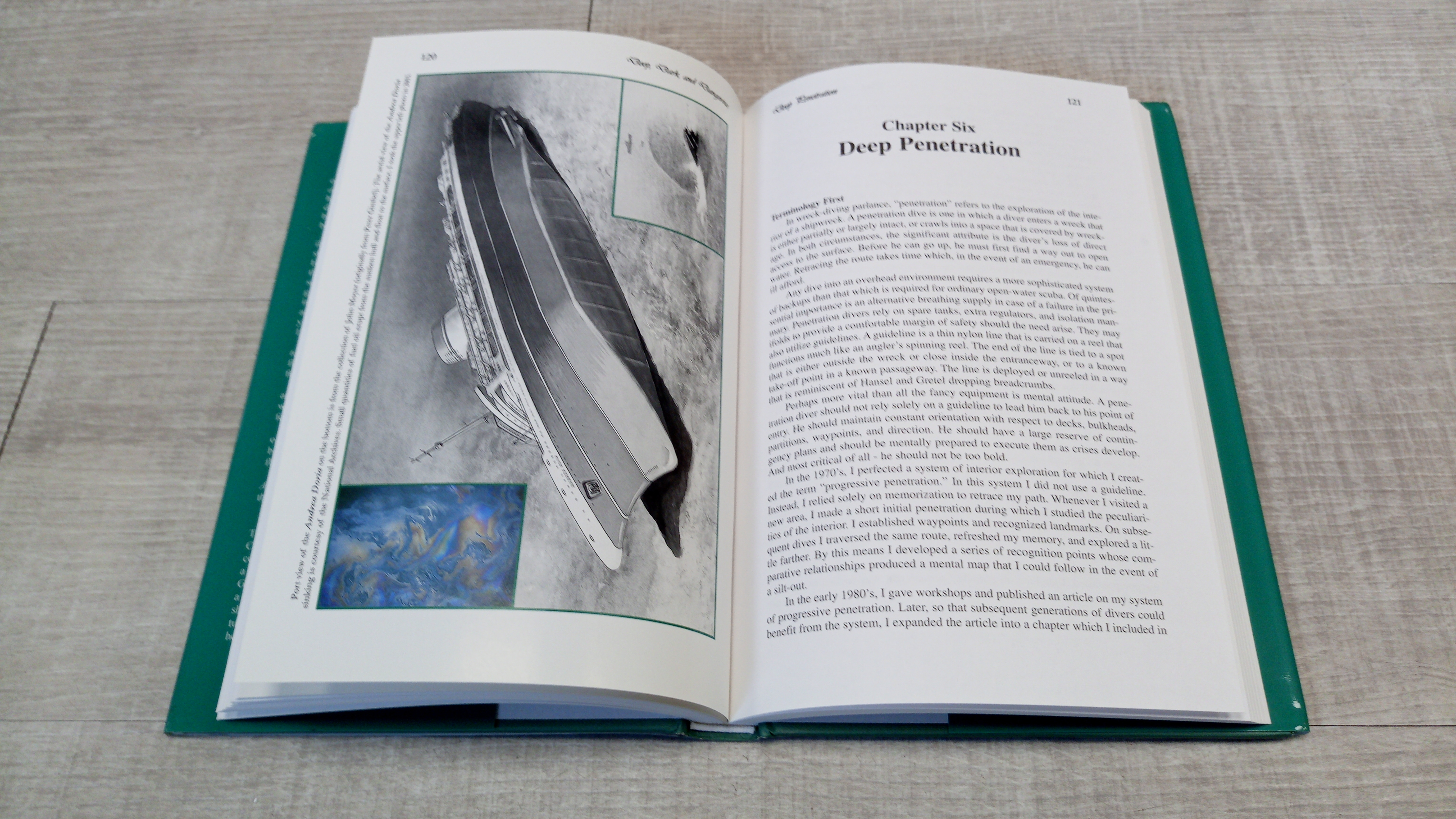 The front cover shows (clockwise from upper left) a Coast Guard helicopter lowering a rescue swimmer, a ceramic panel by renowned Italian artist Romano Rui, a detail of a ceramic panel by Italian pottery maker Guido Gambone, and the panel of which the detail is a part in the process of recovery. The back cover shows the Andrea Doria's final moments (from a picture postcard), and the author holding a Rui panel that he recovered from the First Class Cocktail Lounge.
