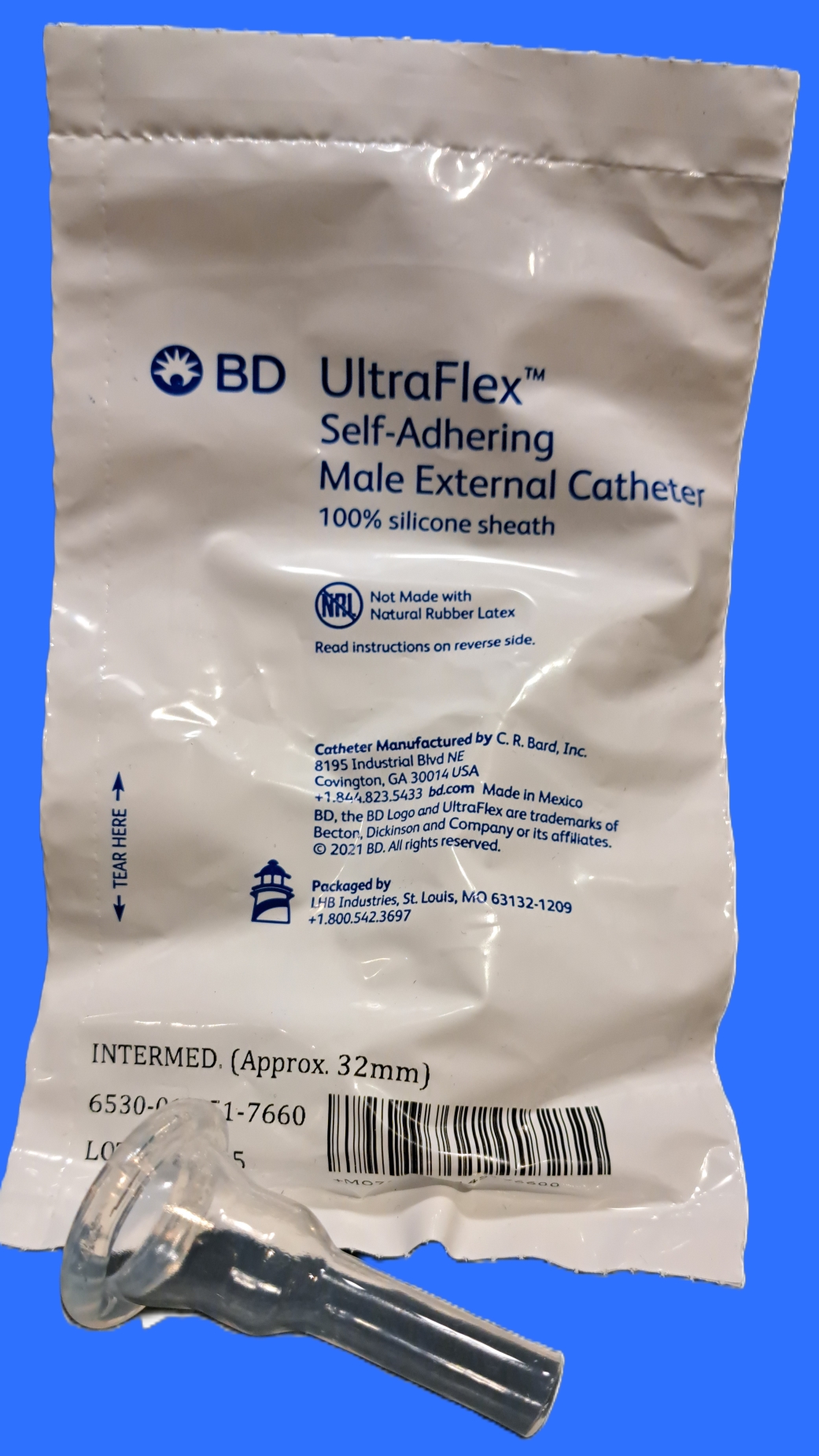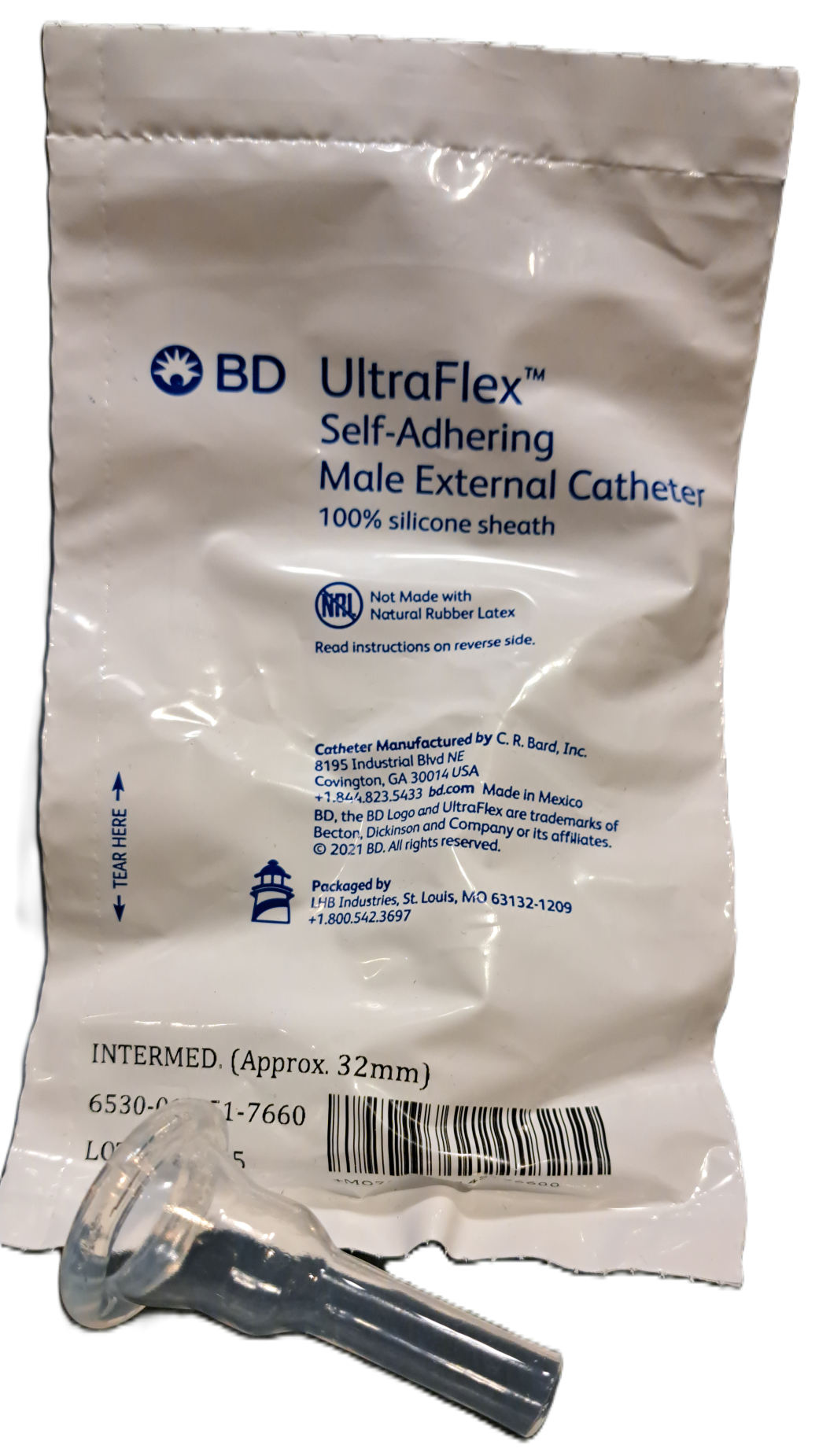 Bardex™ UltraFlex catheter condoom voor Pee Valve. 100% silicone, bevat geen latex. Model UltraFlex heeft een normale plakstrook en wordt per stuk verpakt geleverd zonder "hoedje".