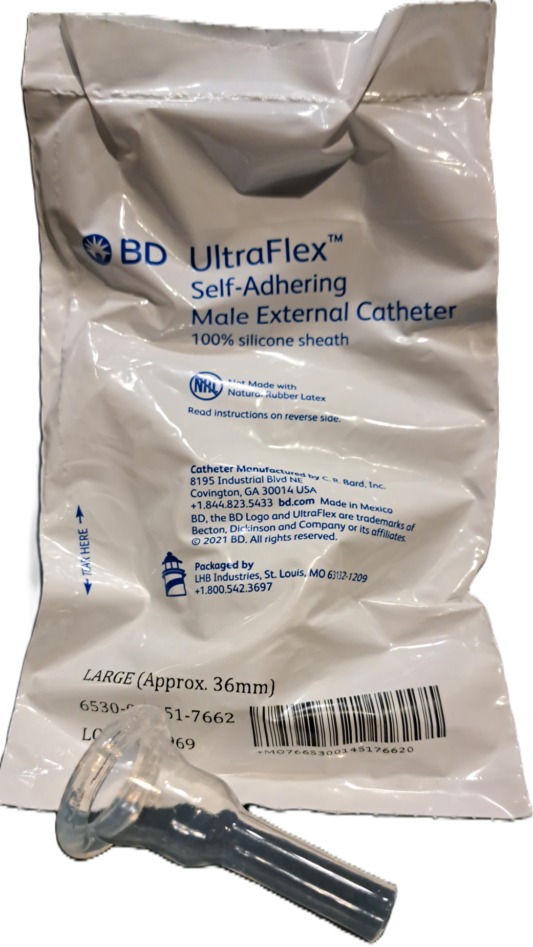 Bardex™ UltraFlex catheter condoom voor Pee Valve. 100% silicone, bevat geen latex. Model UltraFlex heeft een normale plakstrook en wordt per stuk verpakt geleverd zonder "hoedje".