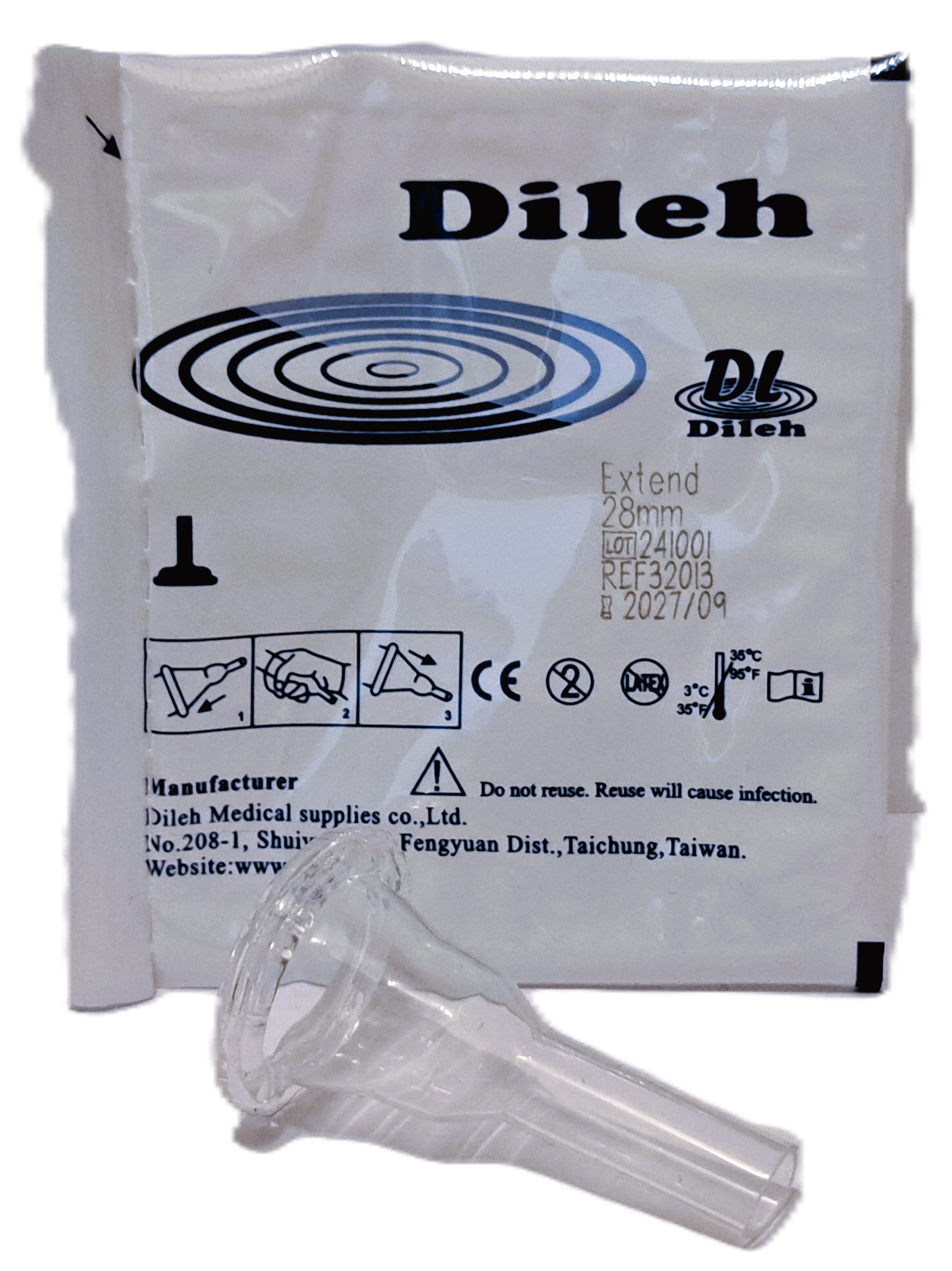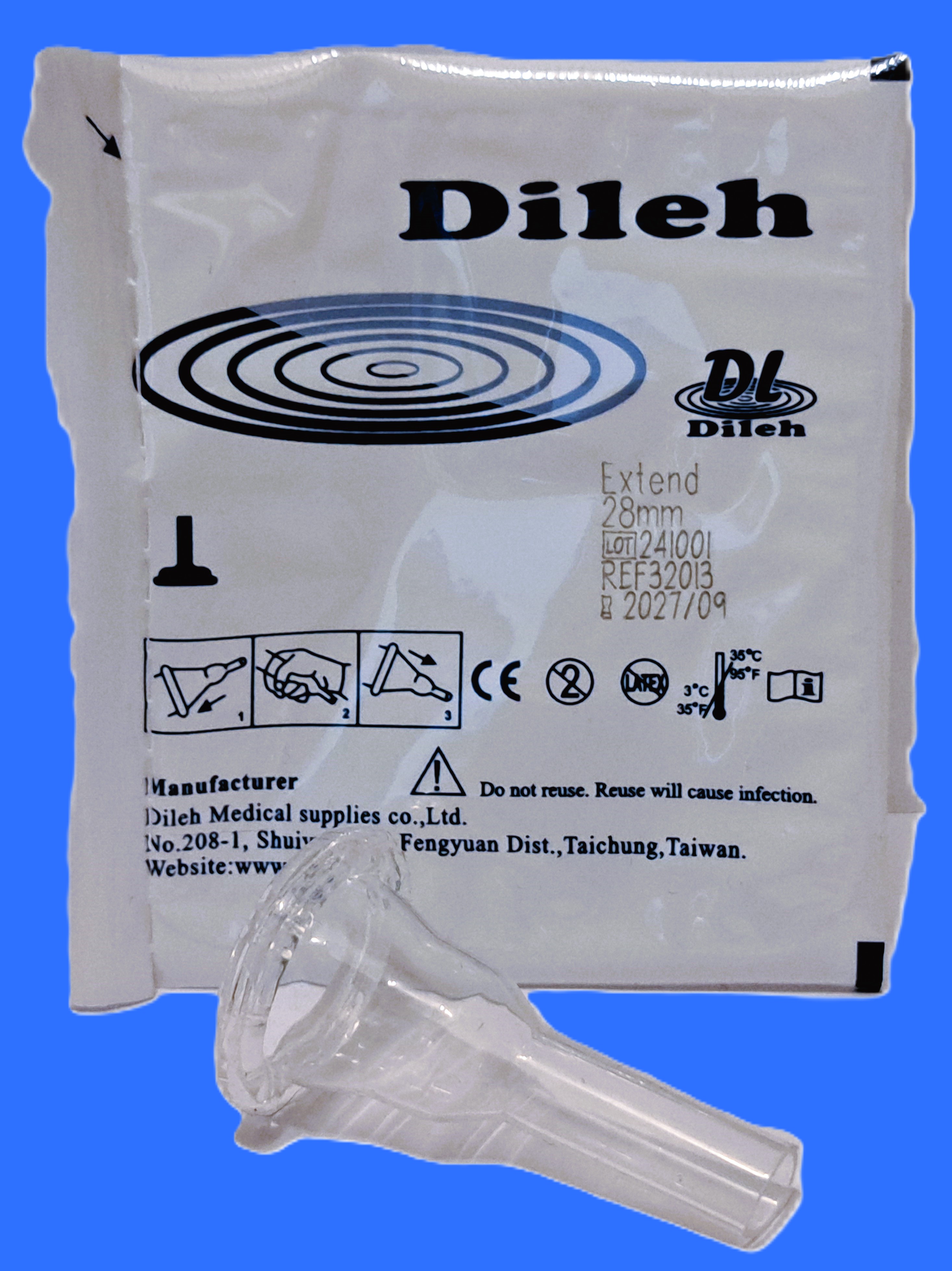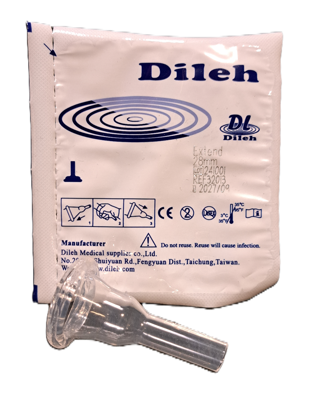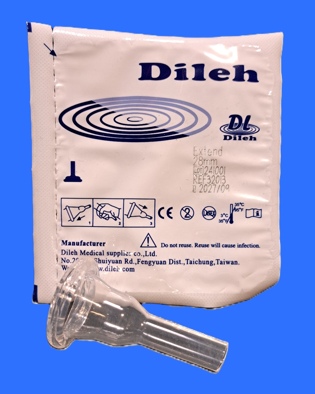 Dileh Extend catheter condoom voor Pee Valve. 100% silicone, bevat geen latex. Model Extend heeft een extra brede plakstrook en wordt per stuk verpakt geleverd.