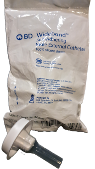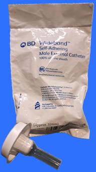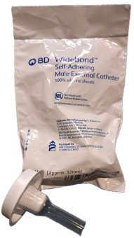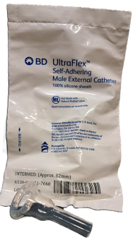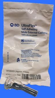 LHB Industries UltraFlex catheter condoom voor Pee Valve. 100% silicone, bevat geen latex. Model UltraFlex heeft een normale plakstrook en wordt per stuk verpakt geleverd zonder "hoedje".